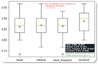 - Testing different imputed strategies. The author proposes to test different strategies when replacing data by comparing the mean, the median, the mode (most frequent) and constant(0) strategies.